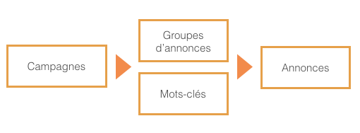 Est-ce que vos annonces sont regroupées en groupe d’annonces? Est-ce que vos groupes d’annonces sont regroupés en campagne? Il est important de bien organiser la structure pour éviter des problèmes comme le dédoublement des annonces et l’oubli de mots-clés importants. De plus, vous et vos collègues aurez plus de facilité à vous retrouver dans toutes vos annonces. Voici la hiérarchie que vous devriez retrouver dans votre compte: