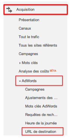 Dans Google Analytics, afin de suivre les performances de vos démarches sur les réseaux de partenaires, vous devez aller dans l'onglet Acquisition, puis dans AdWords et URL de destination :