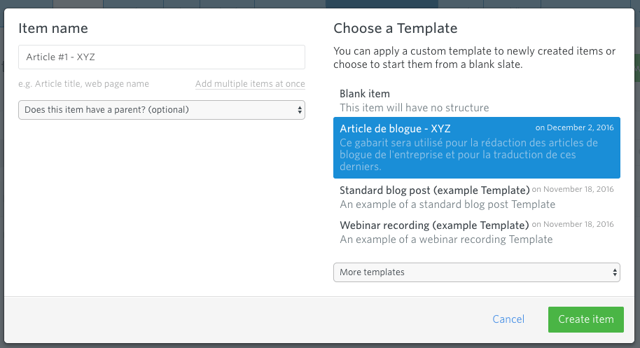 Idéalement, il vaut mieux prendre le temps de créer des gabarits différents dès le départ pour vous assurez qu'aucun élément ne soit manquant et que le tout concorde bien avec les maquettes de votre site, les thèmes à couvrir, le nombre de caractères nécessaires, le SEO à inclure, etc. Dans Gather Content, ces gabarits peuvent être mis en place de façon très personnalisée en fonction de vos contraintes particulières ou besoins puisqu'il s'agit d'un système très simple de « drag and drop ».