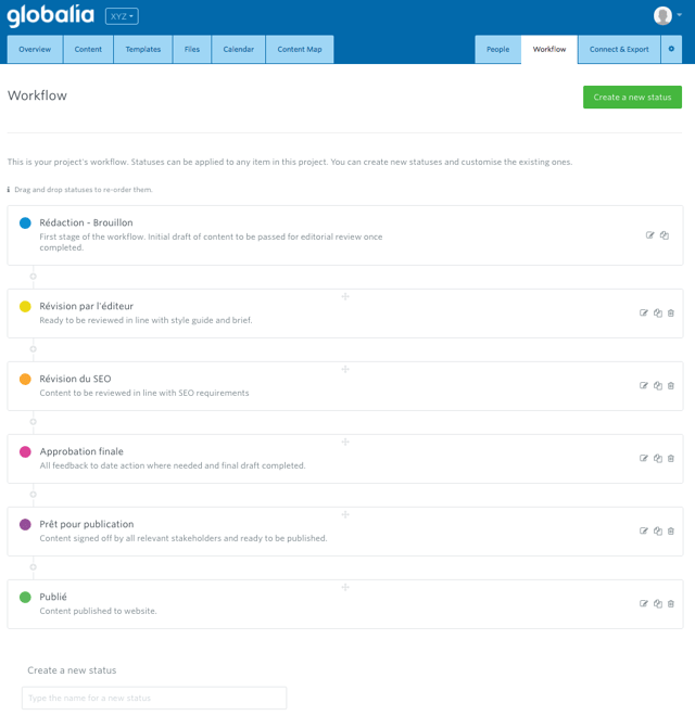 L'une des fonctionnalités les plus importantes (et surtout les plus utiles) que propose Gather Content se situe dans la mise en place de workflows personnalisés pour la production des projets. En effet, il vous est possible de déjà prévoir les différentes étapes qui seront nécessaires dans le cadre de votre projet en instaurant certaines règles automatisées.